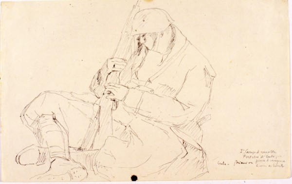 meravigliò il maestro delle elementari con un grande foglio sul quale aveva ritratto tutti i compagni di classe e se a dodici già aveva eseguito il primo ritratto ad olio della madre. Vocazione allarmante, la sua, in una famiglia di piccoli commercianti e che il padre tentò inutilmente di scoraggiare: durante un’assenza da casa del figlio adolescente, usò tutte le tavole e i telai da lui dipinti per costruire, nell’orto, una gabbia per i conigli. L’ebbe vinta, ovviamente, la testardaggine del ragazzo, che eluse le speranze paterne di averlo nel commercio: interrotti gli studi universitari, si iscrisse al Liceo Artistico di Venezia e, a poco più di venti anni, era professore di disegno nelle scuole industriali di Feltre. Nel 1940, poco dopo la sua prima personale di “ritratti” e di “interni” a Venezia, scoppiata la guerra, viene chiamato sotto le armi col grado di sottotenente di fanteria: la sua avventura militare dura sette anni e rimarrà l’esperienza fondamentale della sua vita. C’è da credere che nel suo zaino ci fosse più spazio per matite, boccette d’inchiostro e fogli da disegno che non per munizioni e scatolette di carne. Sul fronte greco-albanese, dove è comandato, disegna dal vero i soldati e tiene un diario. Scendendo in Grecia e poi nel Peloponneso, completa su fogli bianchi («il foglio bianco – dirà più tardi – non ammette scherzi») una serie di bambini così come li vedeva, laceri ed affamati, e, senza saperlo, precedeva, se non altro per la scelta dei soggetti ed il nitido pathos con cui li registrava, la poetica – a lui del tutto estranea – del neorealismo. La macchina bellica lo trasporta nell’isola di Creta e lo colloca, aggregato ai tedeschi, comandante del presidio di Kalò Koriò, Prina e Melesseri. Anche nell’isola, straziata dai bombardamenti tra aride pietraie e mare, l’ambidestrismo (disegni e diario) non lo abbandona. Invia una serie di paesaggi cretesi al “Giornale di Roma”, che si stampava ad Atene; il direttore del quotidiano, Paolo Cesarini, ricorderà (nel 1966,