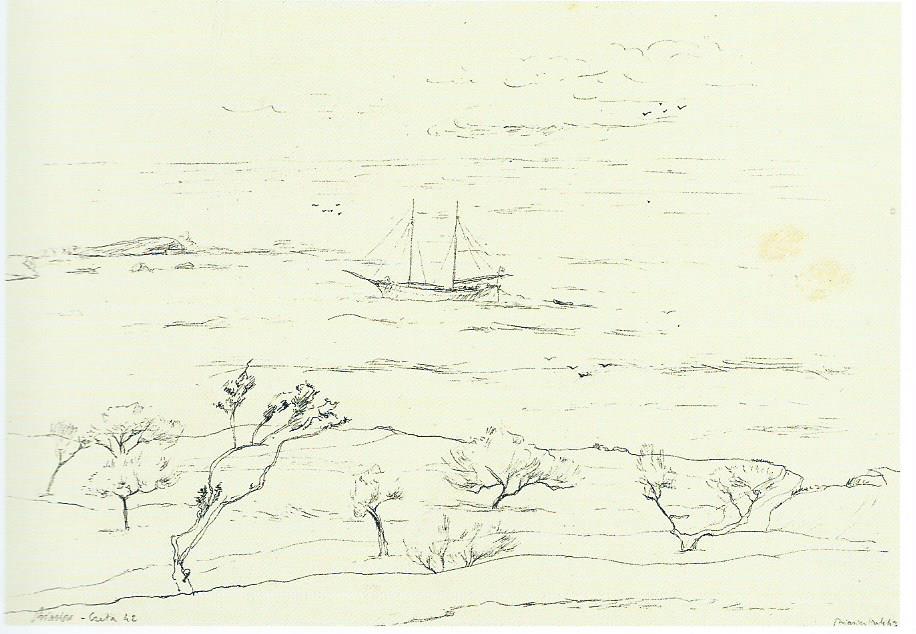 Invece la costa deluse le nostre speranze. Era aspra, dirupata, priva di alberi. Solo qualche carrubo arso dal sole e tormentato dal vento, piegato fino a terra. La terra era sassosa e di color rosso, qua e là rotta da calanchi di creta gialla. Giù per questi calanchi friabili si calarono i soldati arrivando fino agli scogli. Ma avventurarsi fra quegli scogli fatti come taglienti lame sovrapposte, dentro le cui erosioni la schiuma delle onde si introduceva con bolle che il sole faceva scoppiare, era difficile e pericoloso. Per quel giorno il mare lo guardammo soltanto e ci accontentammo del refrigerio che ci dava la sua vicinanza.